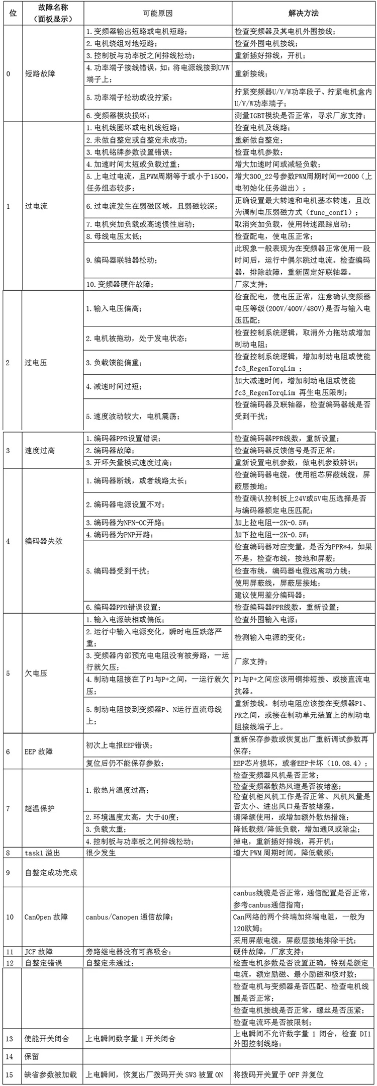 下表為“報(bào)警標(biāo)志位變量”的故障代碼信息與故障的解決方法: